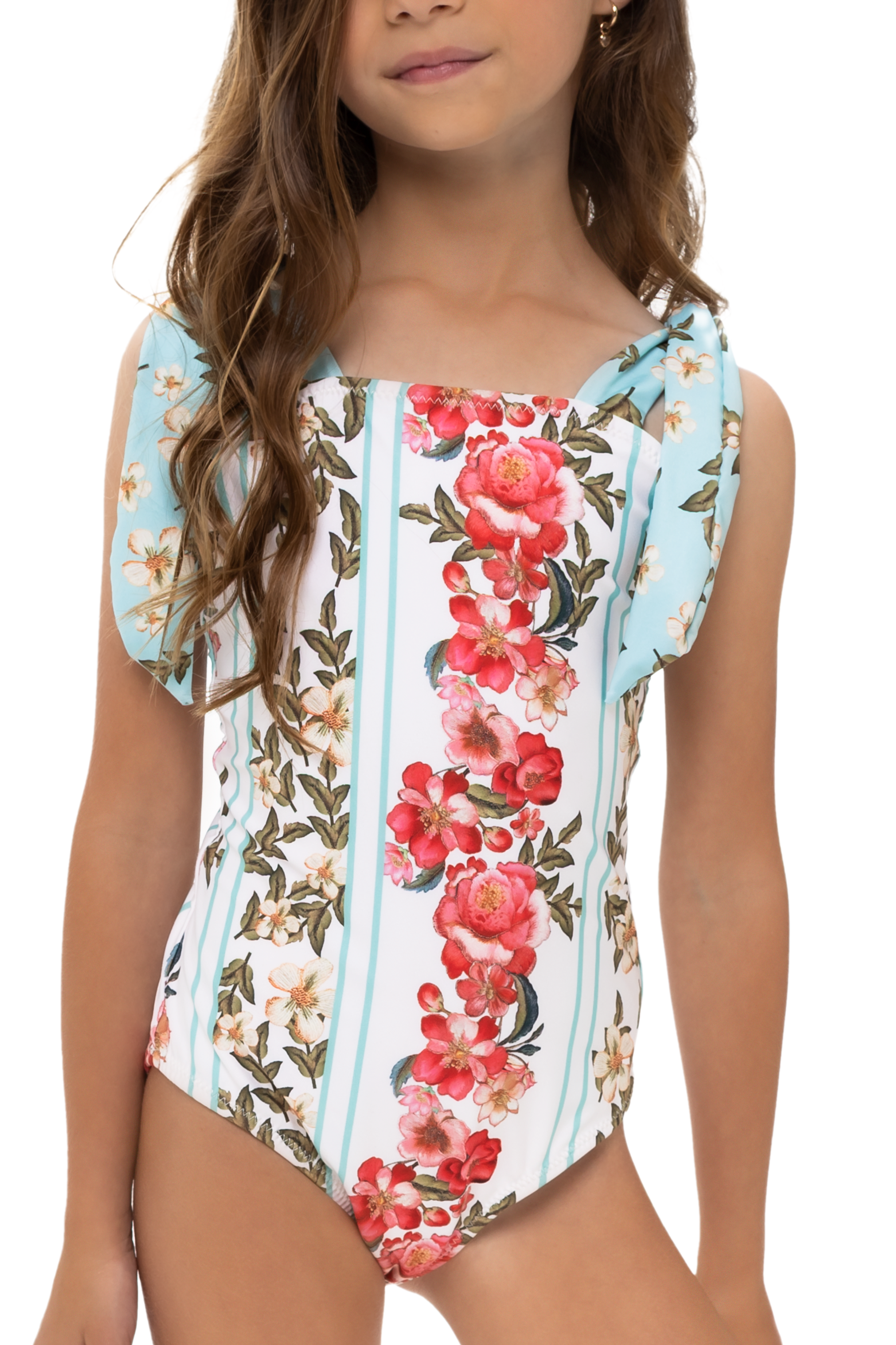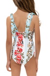 Vestido de baño / Entero Niña, traje de baño de una pieza con estampado floral y textura suave. Su confección elástica y cómoda permite total libertad de movimiento, ideal para disfrutar los días de playa con estilo y diversión.